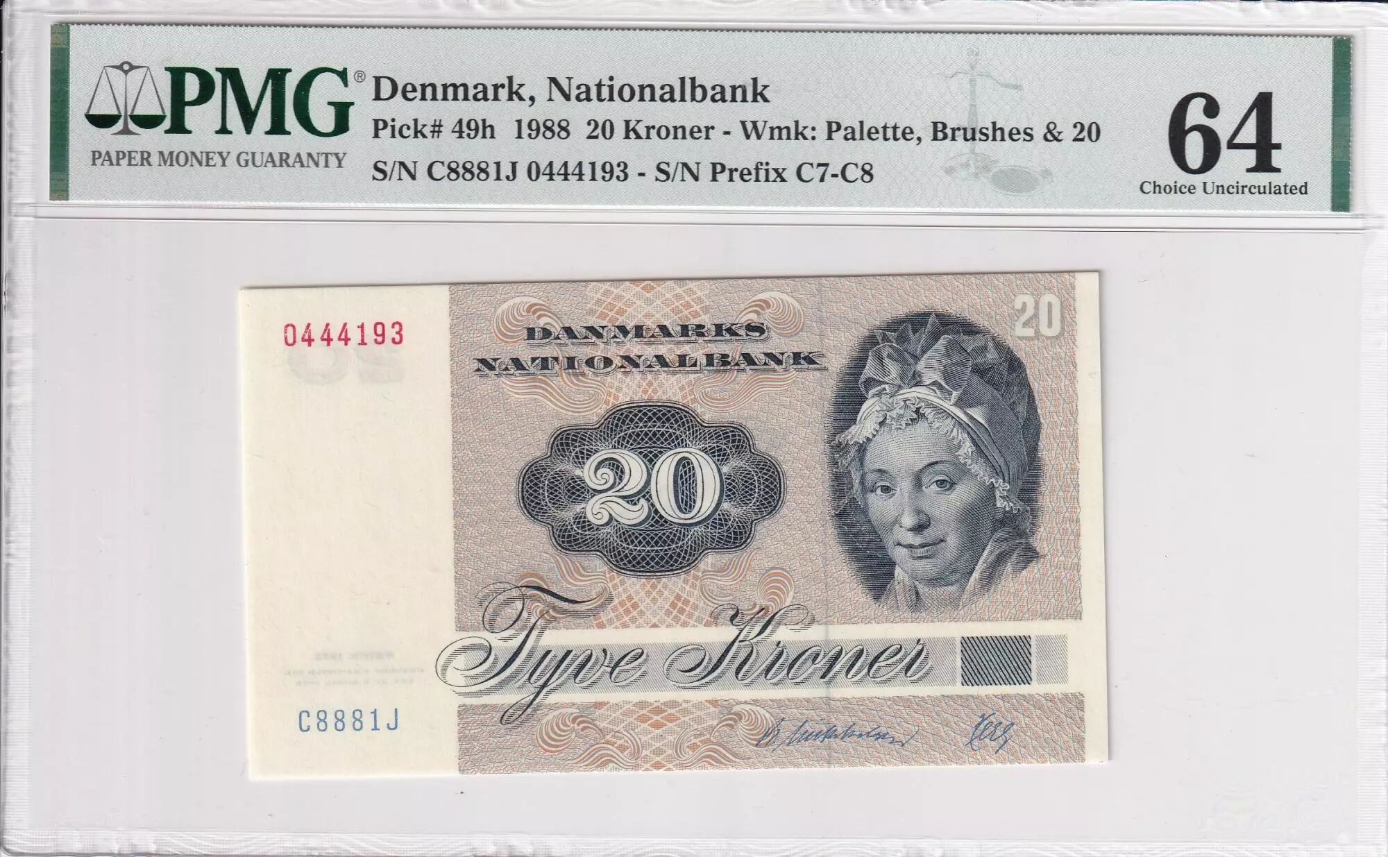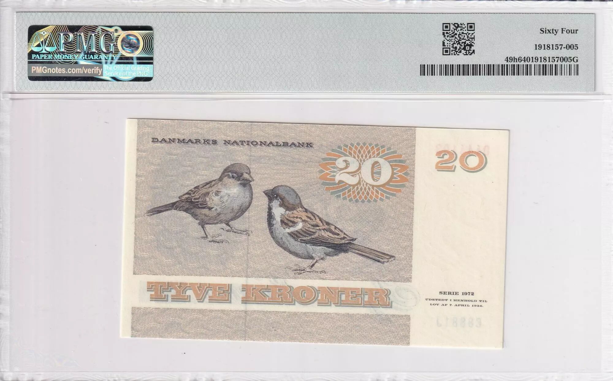 Home > World Banknotes > European Banknotes > Denmark > Denmark 20 Kroner, Pauline Tutein - House Sparrow - Specimen - PMG64 - 1988 - Serial C8