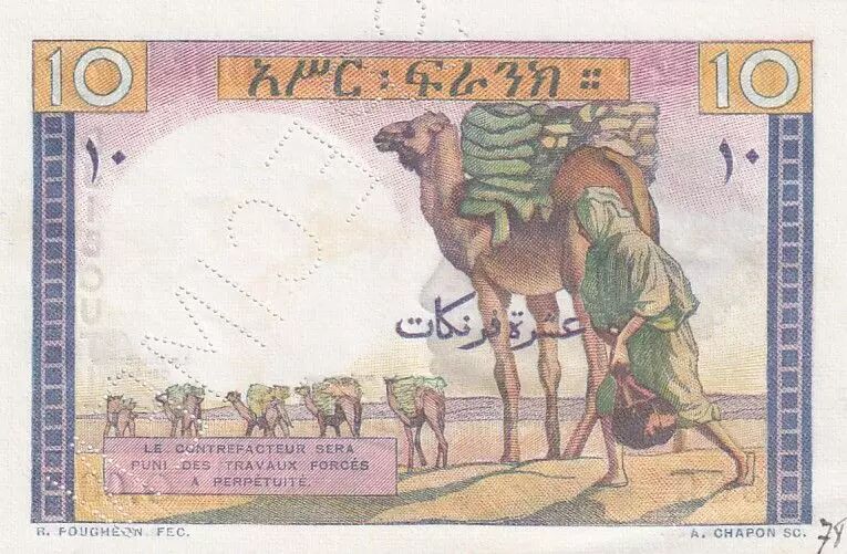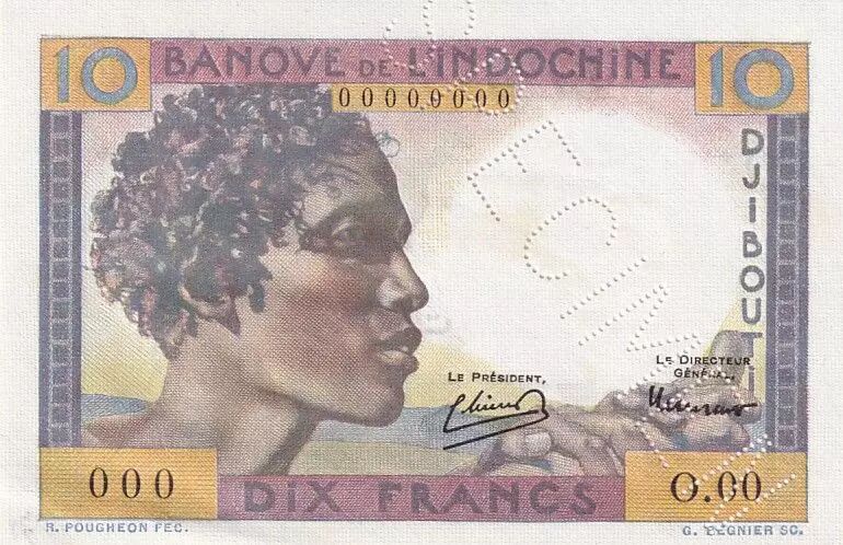 Le billet de 10 francs de Djibouti, émis en 1946, est un spécimen de la Banque de l'Indochine. Ce billet, de dimensions 98 x 65 mm, présente une impression multicolore recto verso, avec une sous-impression également multicolore. Les numéros de série sont imprimés en noir.