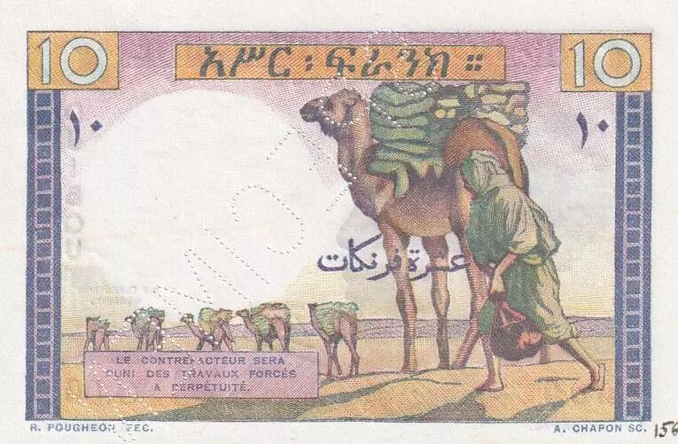 The 10 Francs Djibouti banknote, issued in 1946, features a multicolored front and back print, with a multicolored underprint as well. The serial numbers are printed in black.