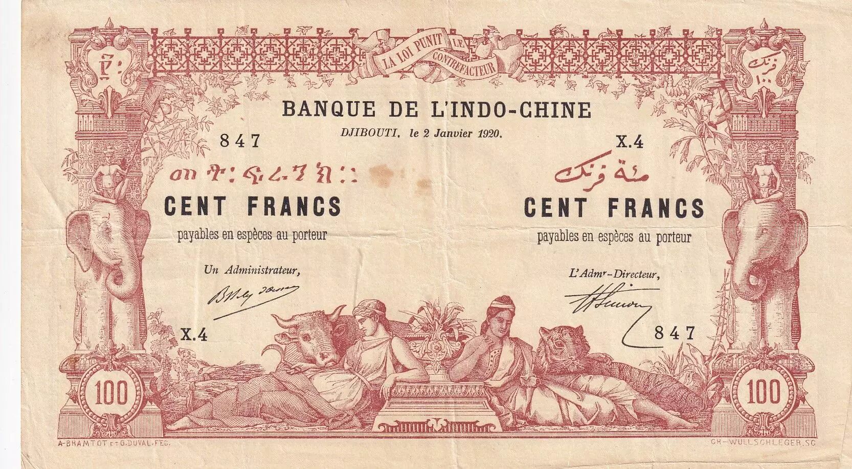 Ce billet de banque de 100 francs a été émis par la Banque de l'Indochine en 1920 pour Djibouti. Le billet appartient à la série X.4.