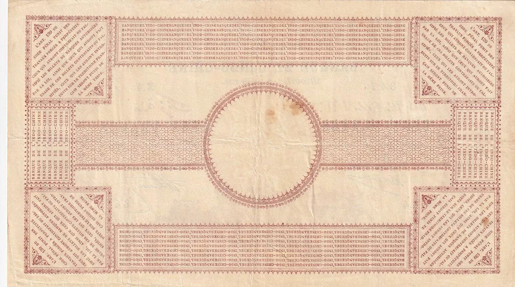 Le verso du billet est également imprimé en marron et présente un motif central circulaire avec des carrés disposés dans les coins. On y trouve un texte en français qui rappelle les peines prévues par l'article 139 du Code Pénal pour la contrefaçon ou la falsification de billets de banque. Le nom de la banque émettrice, Banque de l'Indochine, est également mentionné.