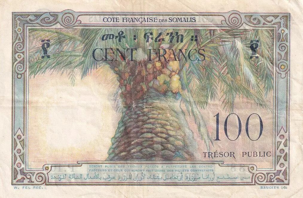 Le verso du billet reprend une impression verte avec une sous-impression multicolore. Le motif central est un palmier. Comme au recto, les textes sont en français, en arabe et en amharique. La valeur « CENT FRANCS » est répétée dans les trois langues, ainsi que la dénomination « CÔTE FRANÇAISE DES SOMALIS » et la mention « TRÉSOR PUBLIC ». Une inscription légale est présente, indiquant que les contrefacteurs et ceux qui utilisent de faux billets seront punis de travaux forcés à perpétuité. Les noms des graveurs W. FEL et BAUDIER sont également indiqués.
