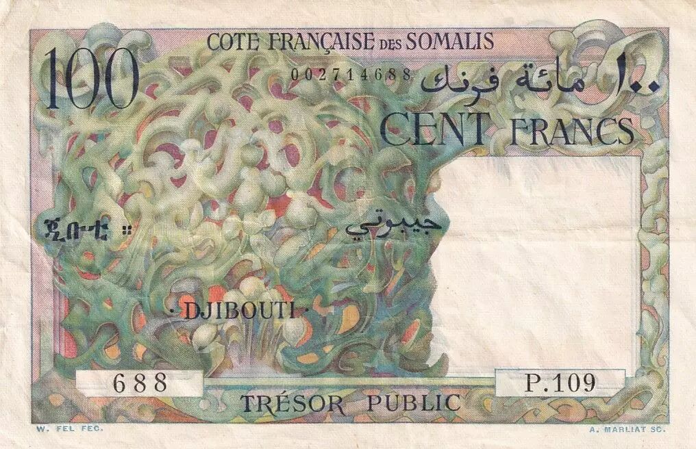 Le billet de 100 francs de la Côte Française des Somalis, émis en 1952, fait partie de la série P.109. Il mesure 131 mm de longueur et 84 mm de largeur.