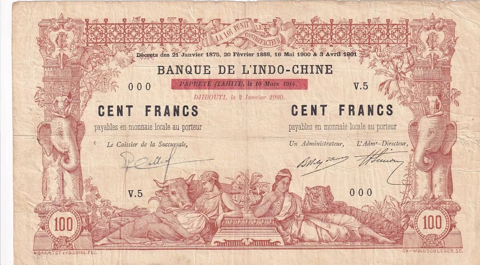 This banknote is an issue from Djibouti, with a face value of 100 francs. It is an overprint applied to a banknote originally issued in Papeete, Tahiti. The indicated issue date is January 2, 1920, and it belongs to the V.5 series.