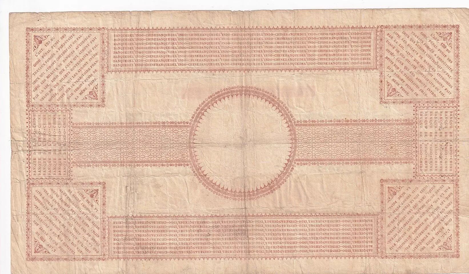 The back of the banknote is also printed in brown. The central motif is a circle, completed by squares arranged in the corners. The text, in French, warns against counterfeiting banknotes, referring to article 139 of the Penal Code. The name of the Banque de l'Indochine is also mentioned. The names of the designers and engraver are the same as on the front.