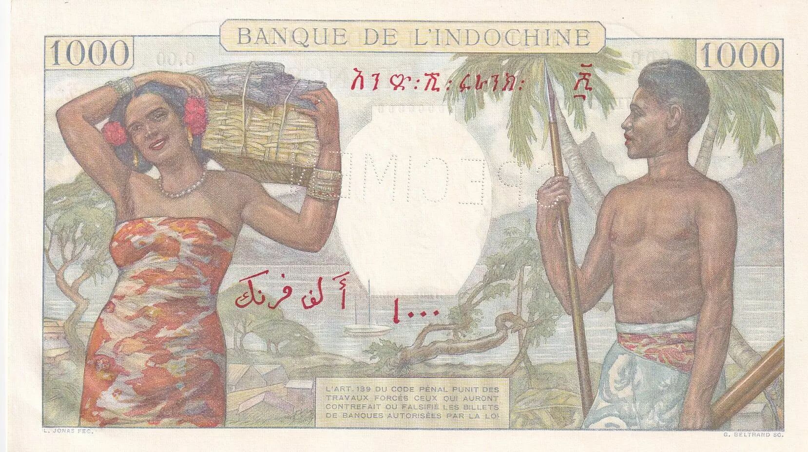 The inscriptions on the reverse include: BANQUE DE L'INDO-CHINE, followed by a legal mention: L'ARTICLE 139 DU CODE PENAL PUNIT DES TRAVAUX FORCÈS CEUX QUI AURONT CONTREFAIT OU FALSIFIÉ LES BILLETS DE BANQUE AUTORISÉE PAR LA LOI. The face value of 1000 is repeated, and the names of L. JONAS and G. BELTRAND are mentioned again.