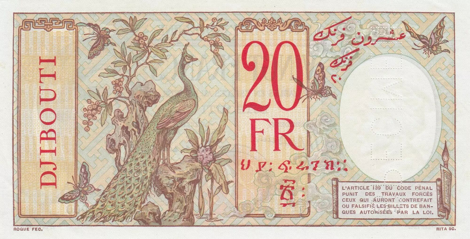 Billet Djibouti 20 Francs au Paon, à plats rouges - Spécimen - ND (1938) - NEUF - Kol.612s