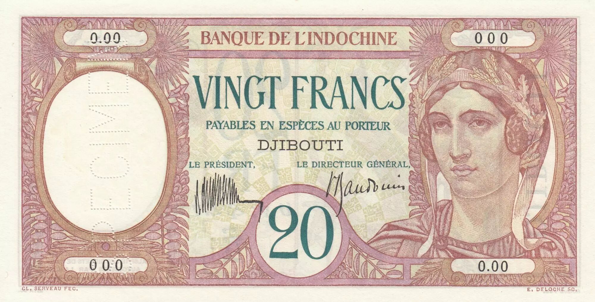 Billet Djibouti 20 Francs au Paon ND (1932) - Spécimen - Neuf