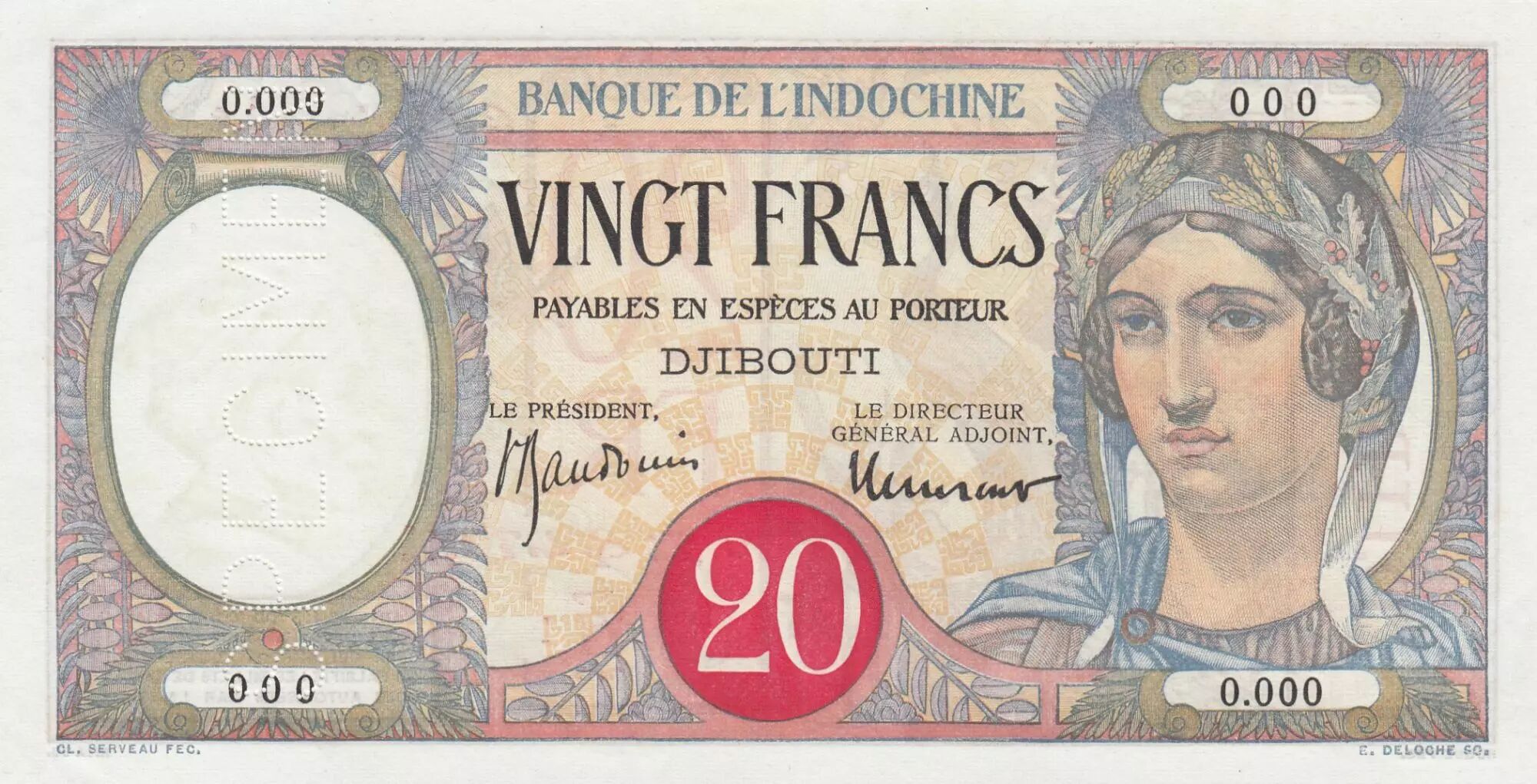 Home > World Banknotes > African Banknotes > Djibouti > Djibouti 20 Francs Peacock, red circle - Specimen - ND (1938) - UNC - P.7Bs