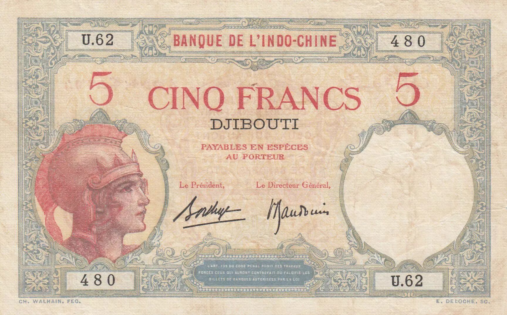 Billet Djibouti 5 Francs Walhain - 1938 - P.6b - TB + - Série U.62