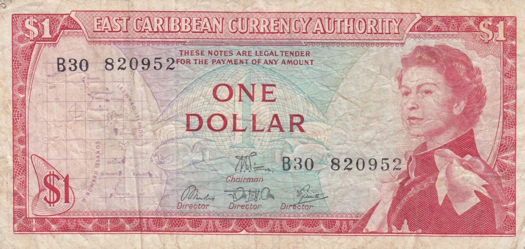 This banknote is a Dollar issued by the Caribbean Islands in 1965.