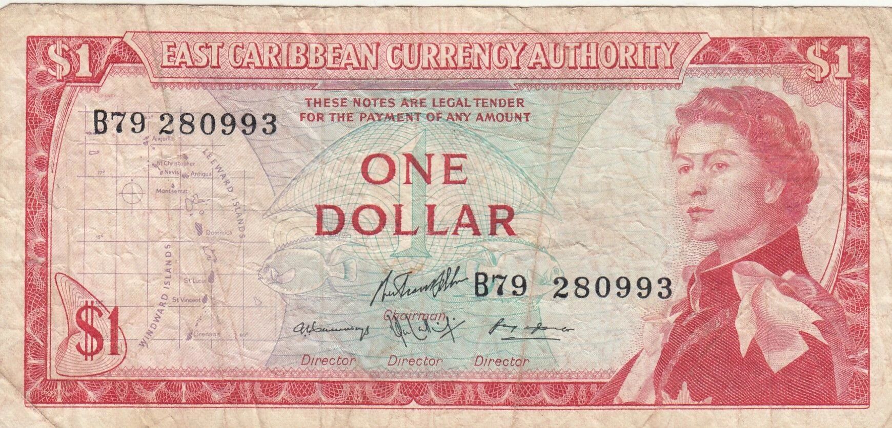 This banknote is a Dollar issued by the Caribbean Islands in 1965.