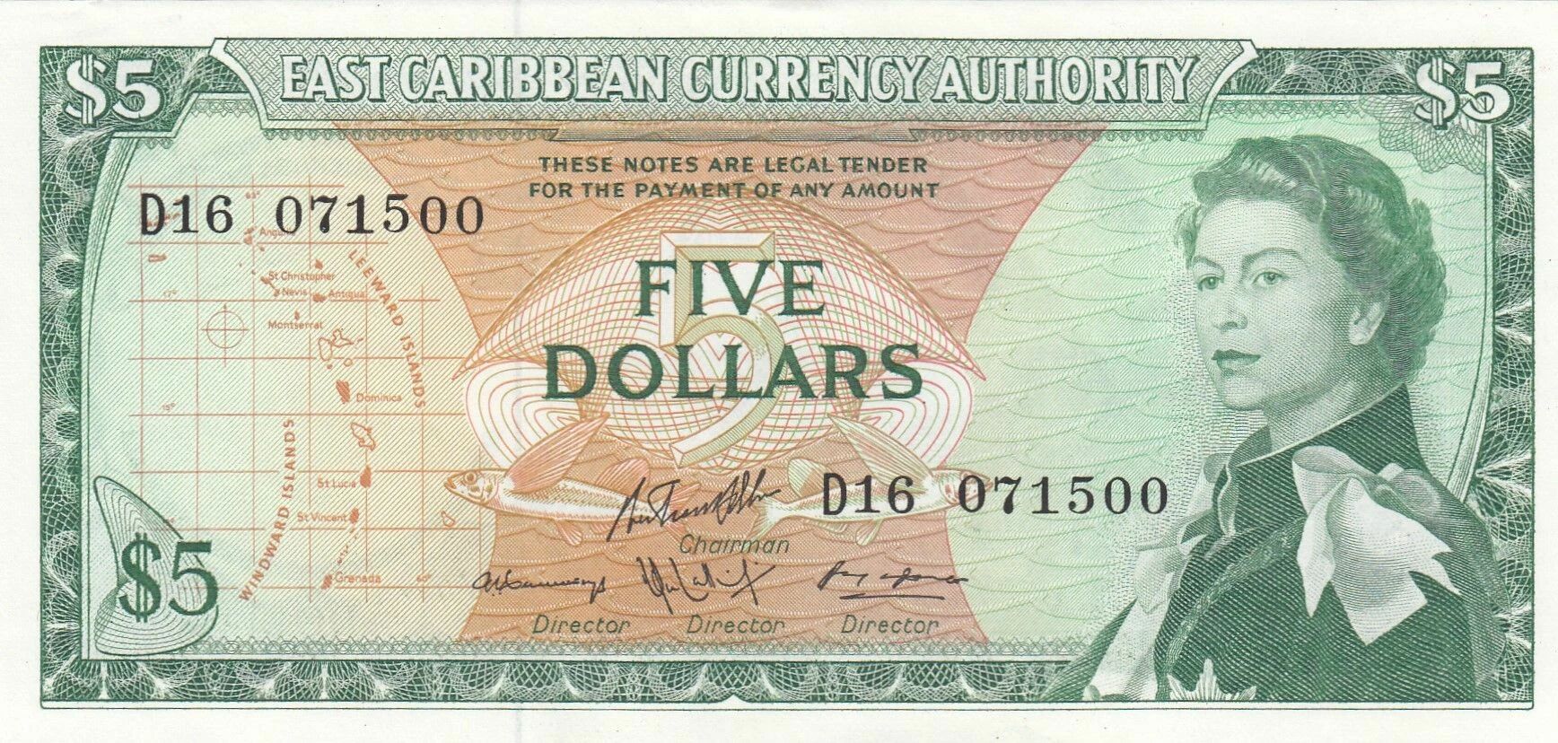 The following inscriptions appear in Latin: "EAST CARIBBEAN CURRENCY AUTHORITY", "THESE NOTES ARE LEGAL TENDER FOR THE PAYMENT OF ANY AMOUNT", and "FIVE DOLLARS".