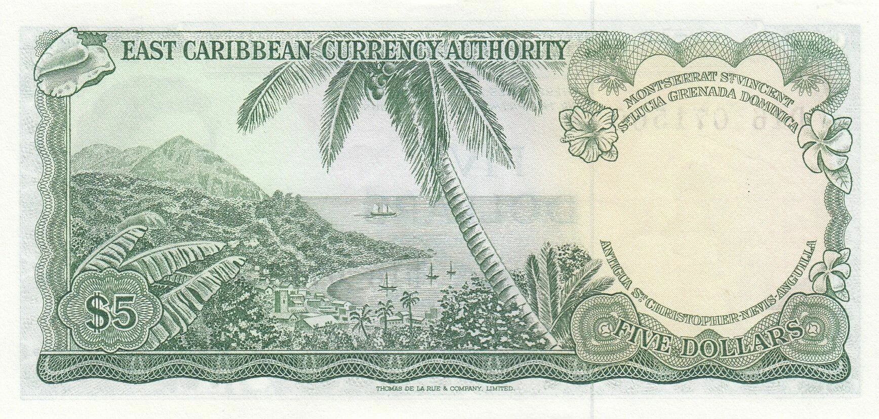 This banknote is issued by the Eastern Caribbean Currency Authority. It has a face value of five dollars.
