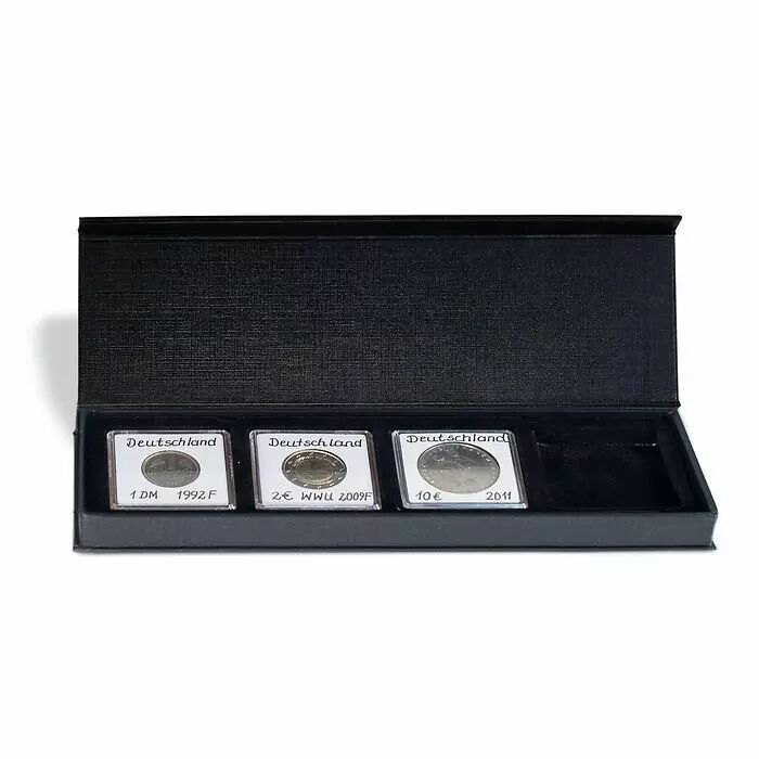 Ecrin noir en carton solide pour capsules CarréRond. Le clou : avec fonction de présentation pour montrer les pièces de monnaie. Plateau avec fond recouvert de feutrine noire. Système de fermeture discret avec aimants. Les capsules ne sont pas comprises dans la livraison.