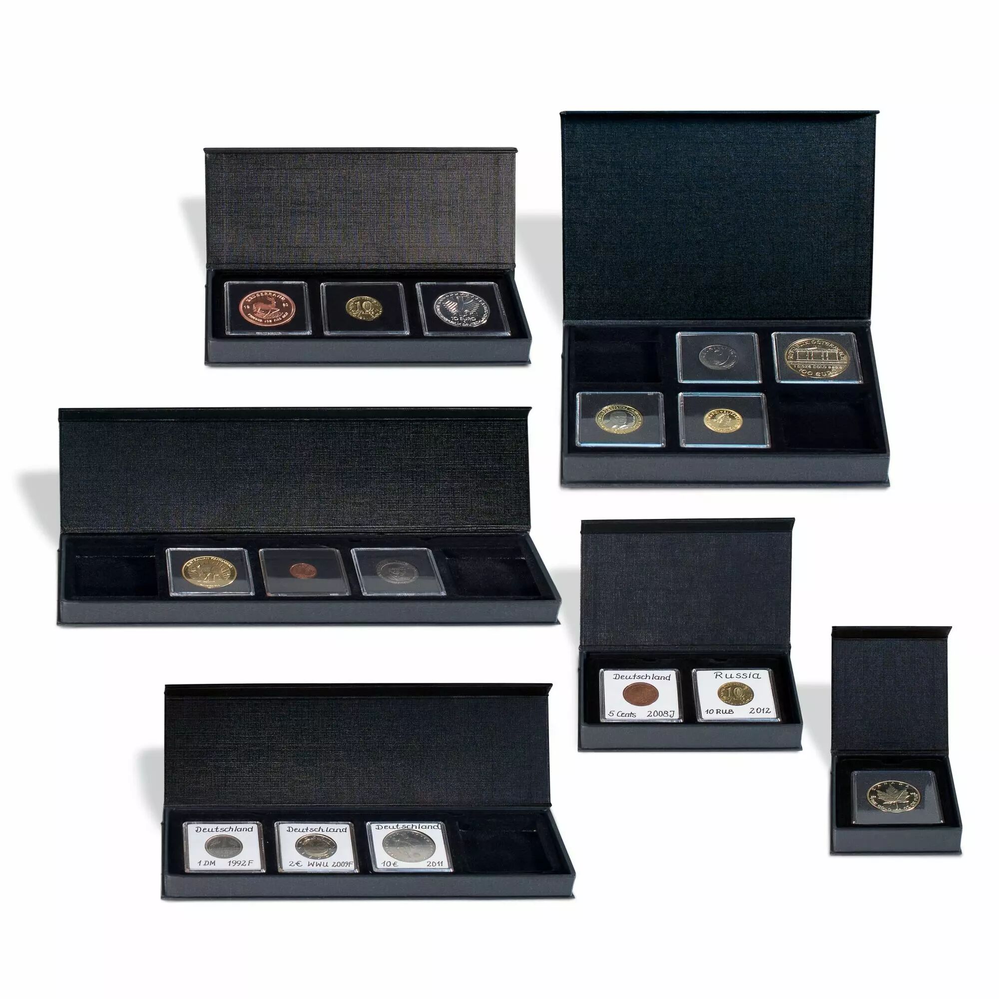 Ecrin noir en carton solide pour capsules CarréRond. Le clou : avec fonction de présentation pour montrer les pièces de monnaie. Plateau avec fond recouvert de feutrine noire. Système de fermeture discret avec aimants. Les capsules ne sont pas comprises dans la livraison.