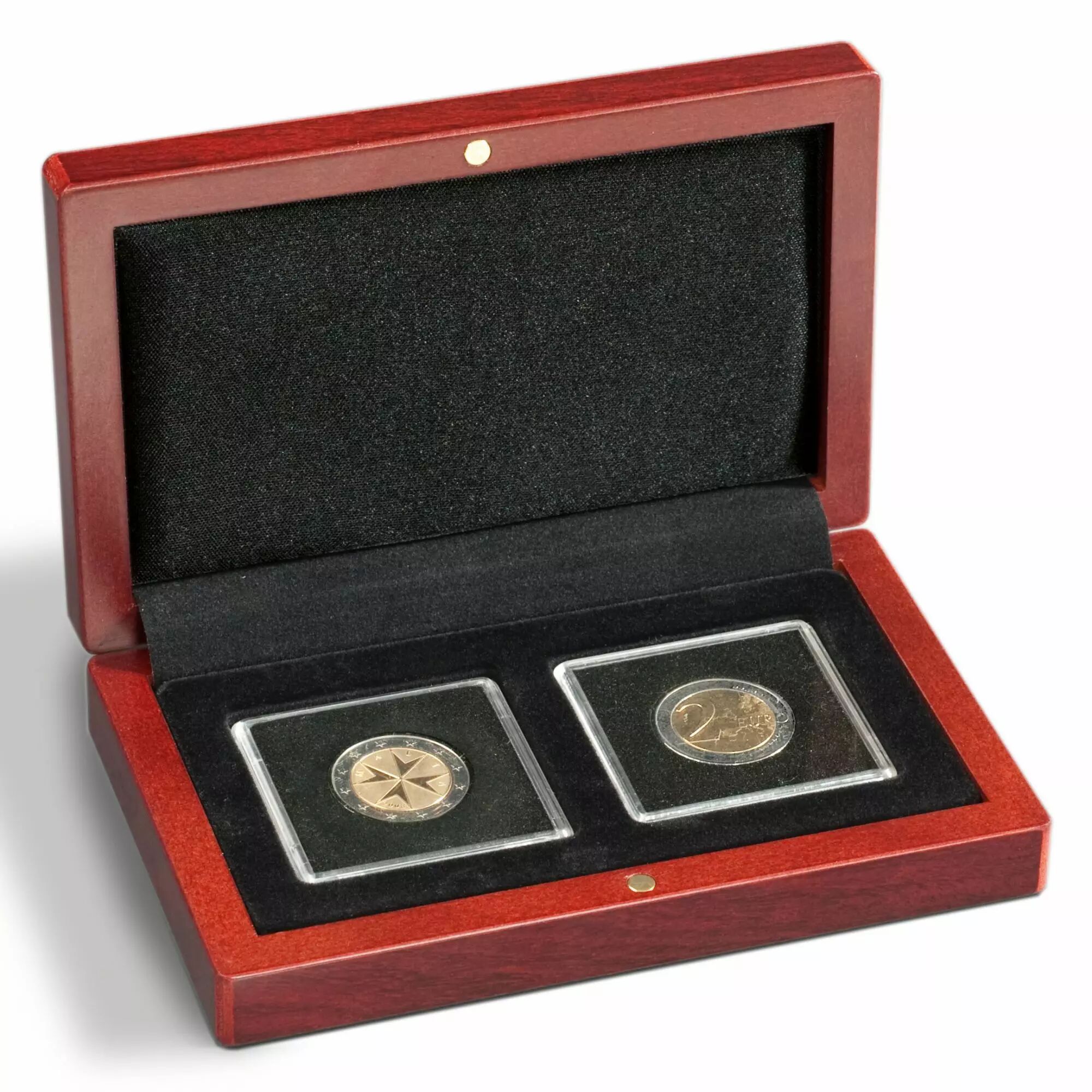 Étui numismatique en façon acajou pour classer des capsules CarréRond. L'intérieur de couvercle est tapissé de satin noir, le fond est recouvert de feutrine. Alvéoles d'un diamètre de 50 x 50 mm. Il est facile de soulever les capsules par le mécanisme intégré. Avec un ruban de satin dans le couvercle pour maintenir un éventuel certificat.