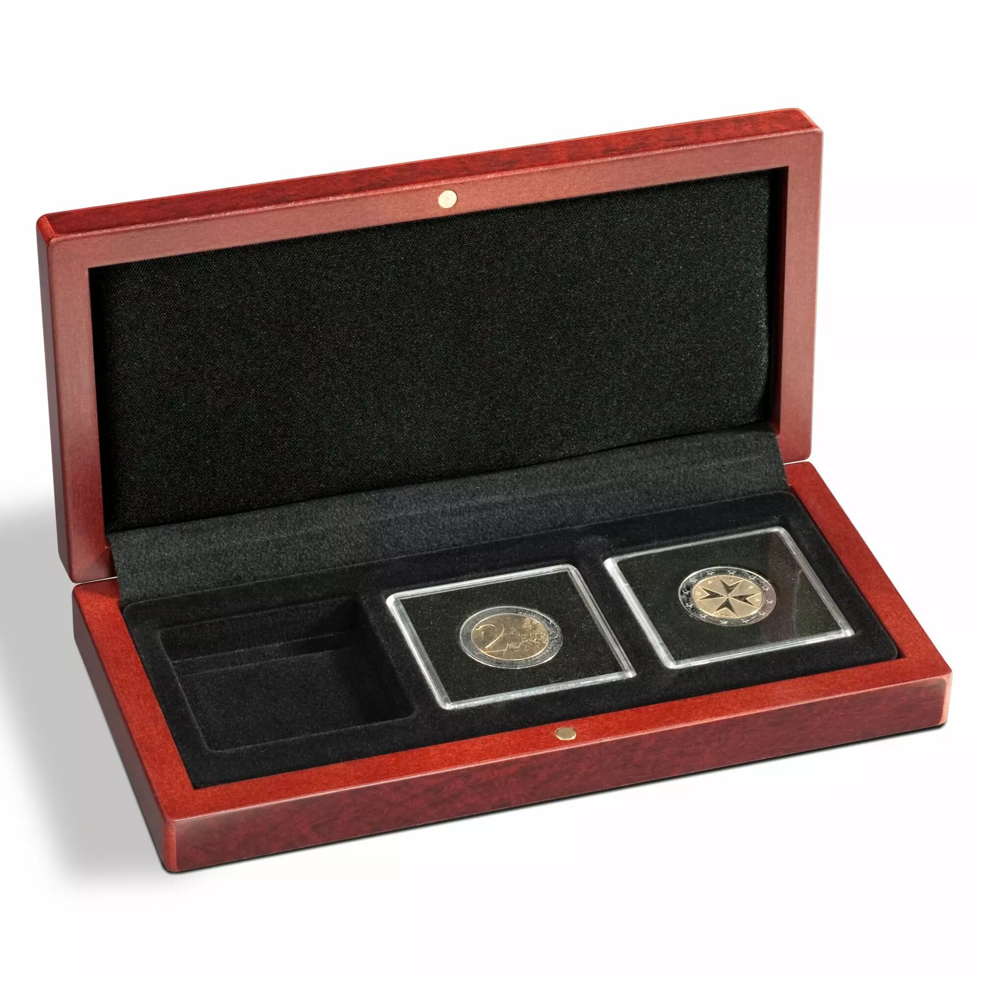 Étui numismatique en façon acajou pour classer des capsules CarréRond. L'intérieur de couvercle est tapissé de satin noir, le fond est recouvert de feutrine. Alvéoles d'un diamètre de 50 x 50 mm. Il est facile de soulever les capsules par le mécanisme intégré. Avec un ruban de satin dans le couvercle pour maintenir un éventuel certificat.