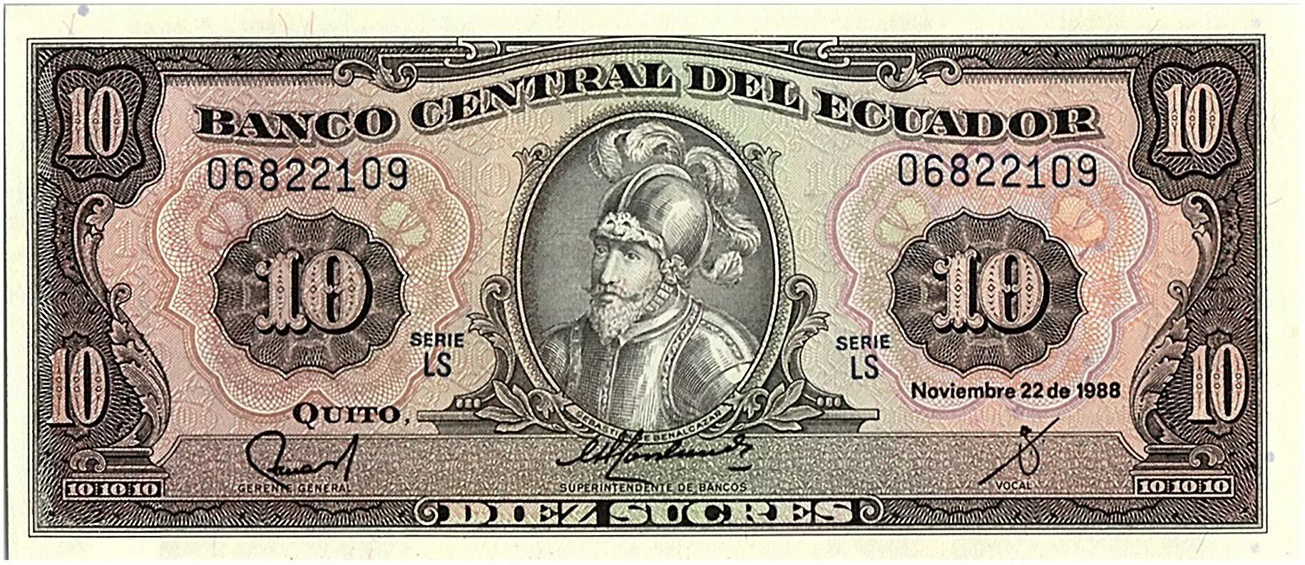 Home > > Ecuador 10 Sucres - Sebastian de Benalcazar - arms - 1988