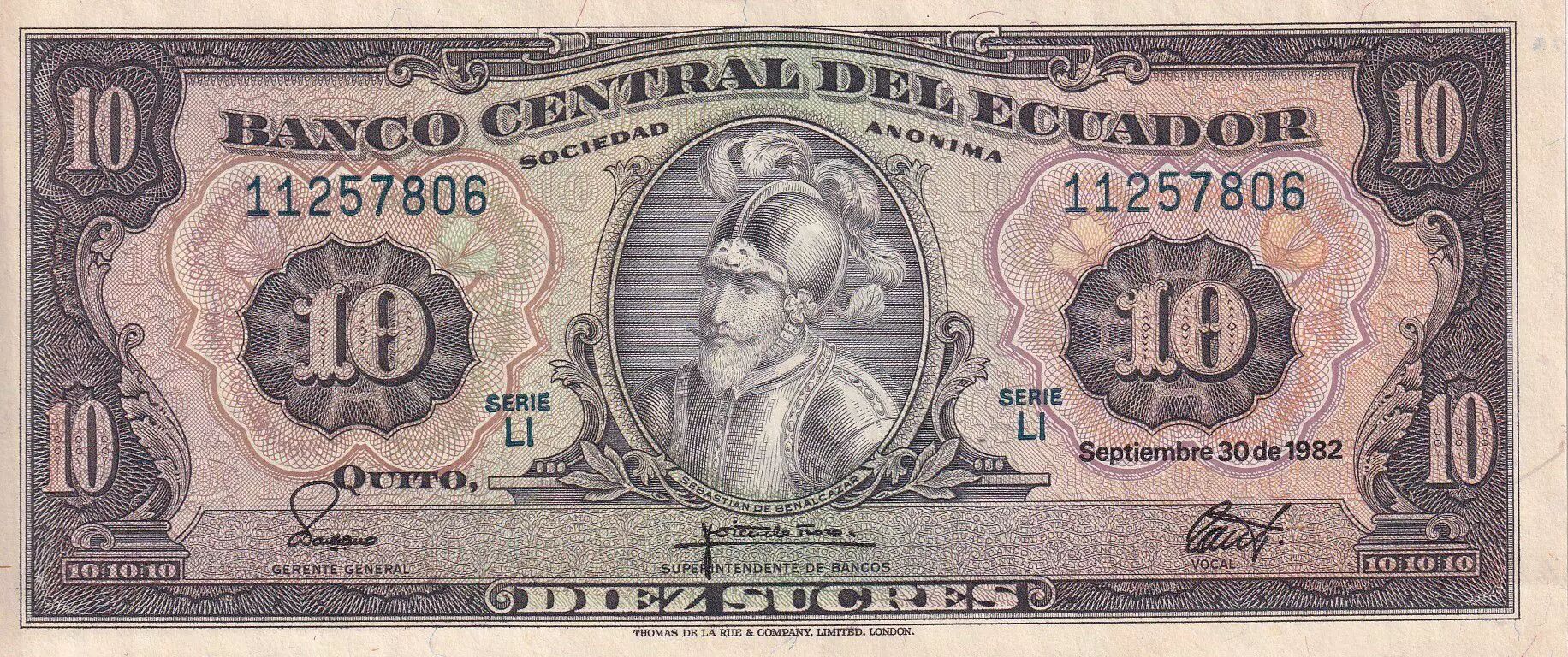 Banknote Ecuador 10 Sucres - Sebastian de Benalcazar - Condor - 1982 - Serial LI - AU+ - P.114b