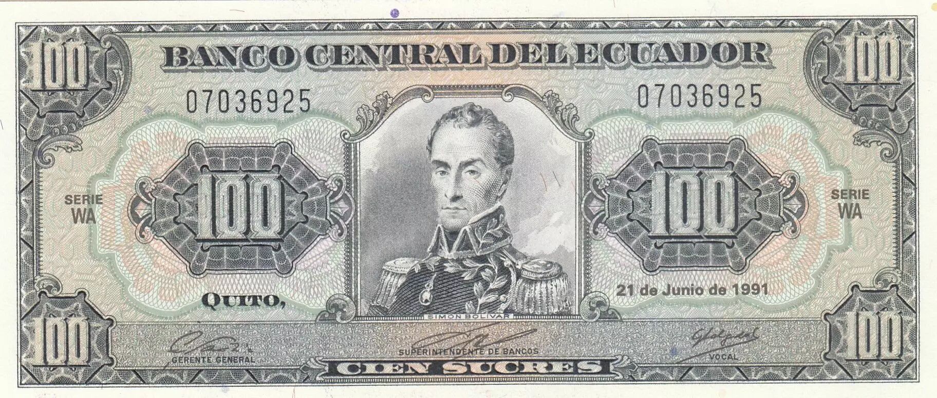 Banknote Ecuador 100 Sucres - Simon Bolivar - coat of arms - 21-06-1991 - Serial WA