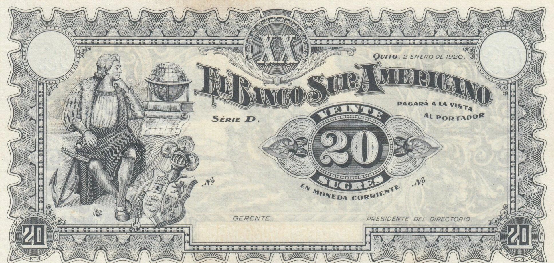 This banknote is issued by Ecuador and has a face value of 20 sucres. It dates from the year 1920.