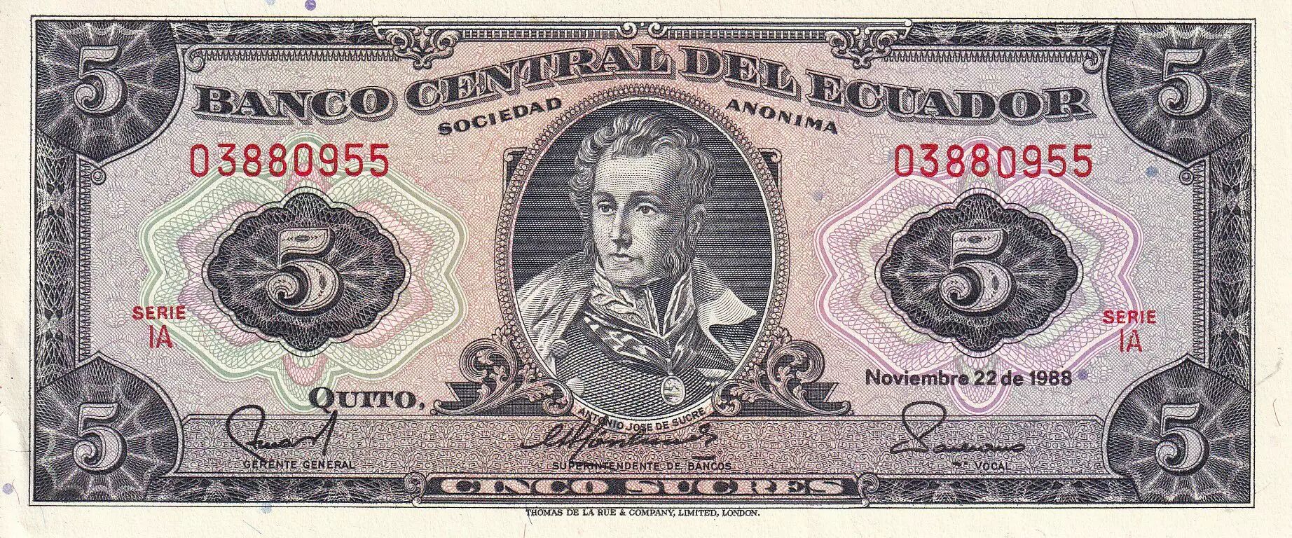 Banknote Ecuador 5 Sucres - Antonio José de Sucre - Condor - 1988 - Serial IA - AU+ - P.113d
