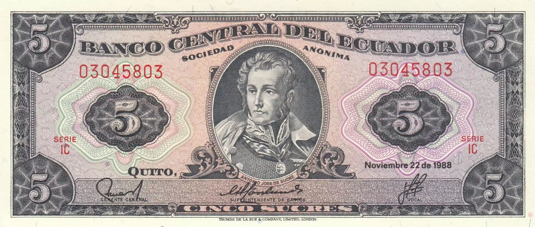 Home > World Banknotes > American Banknotes > Ecuador > Ecuador 5 Sucres - Antonio José de Sucre - Condor - 22-11-1988 - Serial IC