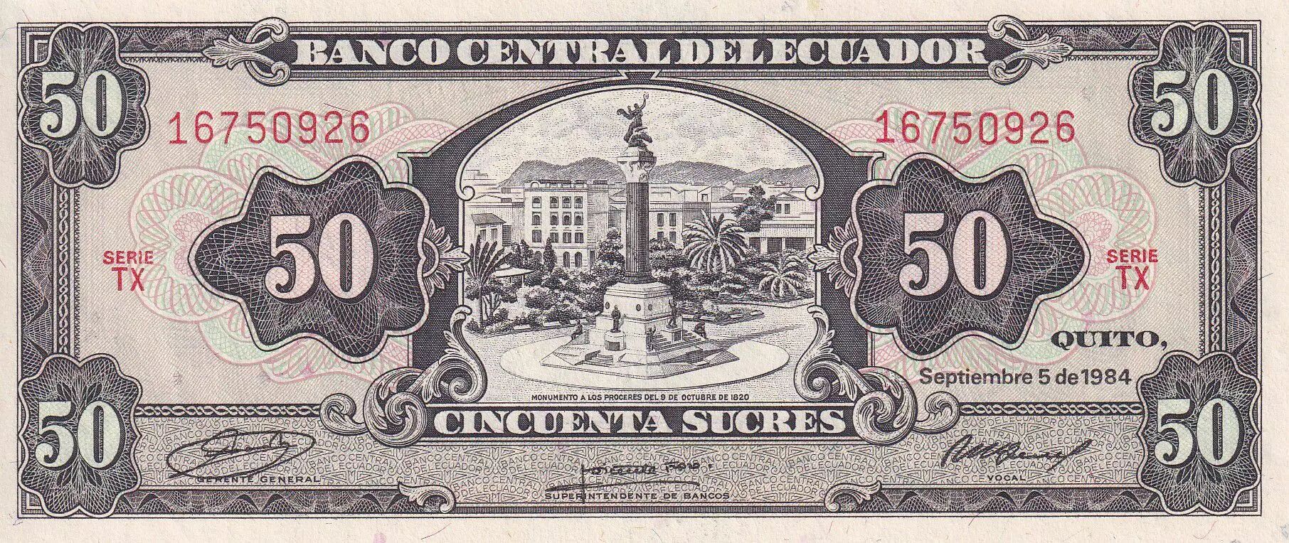 Banknote Ecuador 50 Sucres - Monument - Condor - 1984 - Serial TX - P.122