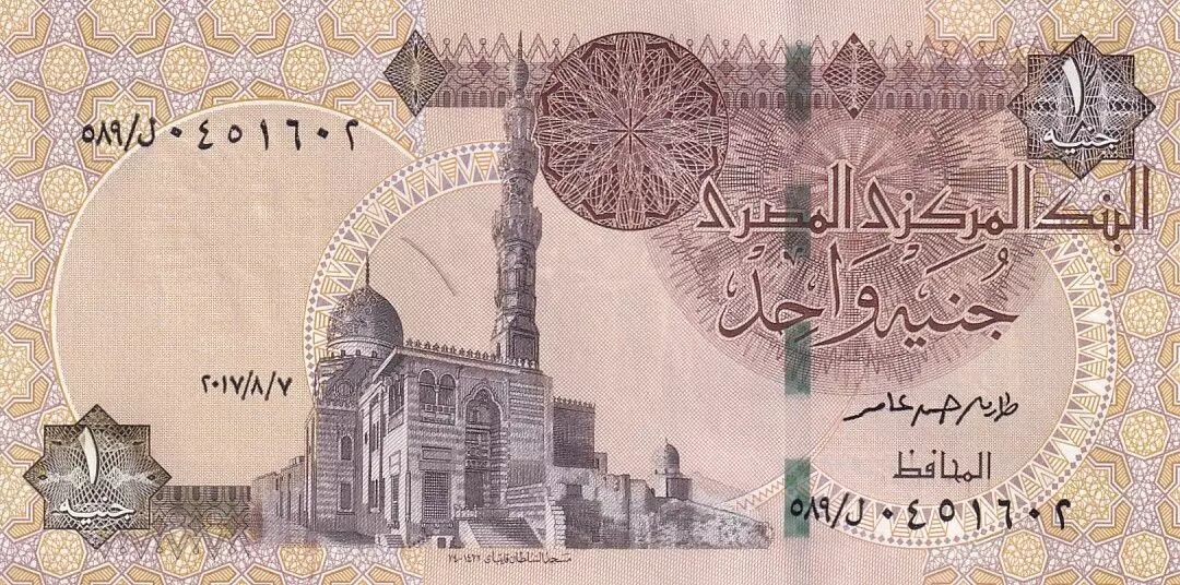 This Egyptian banknote, with a face value of one Egyptian pound, was issued in 2017. It measures 140 mm long by 70 mm wide.