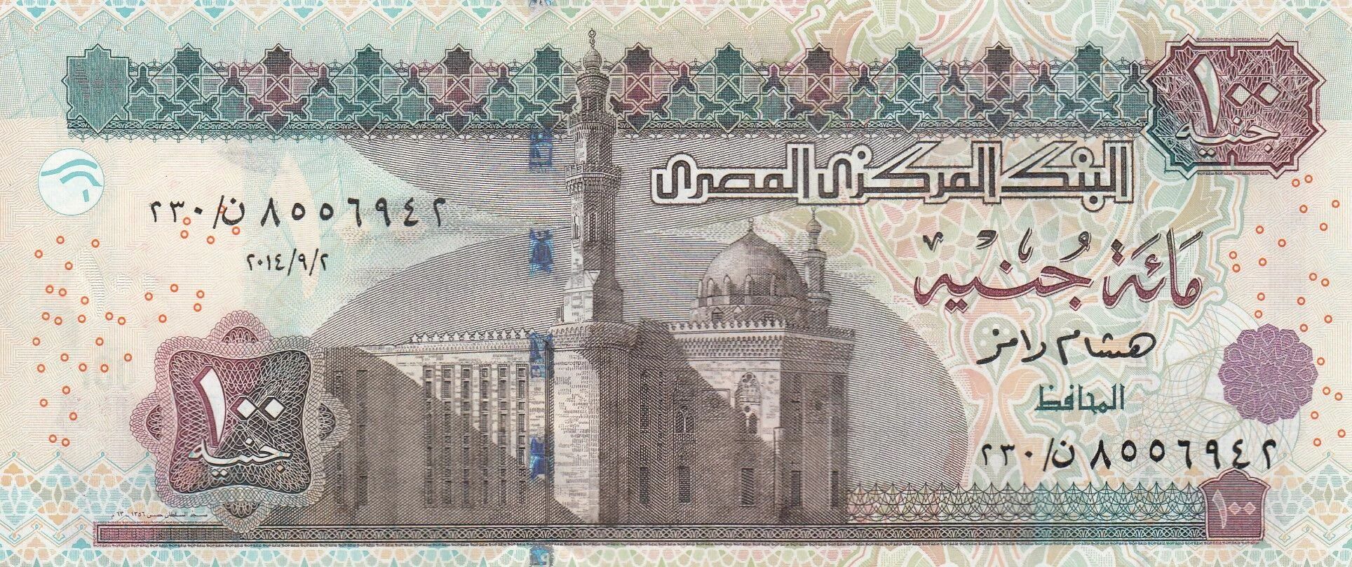 The obverse of the banknote highlights the Sultan Hassan Mosque, located in the lower left part of the center of the banknote. Inscriptions in Arabic and Kufic Arabic also appear on this side.