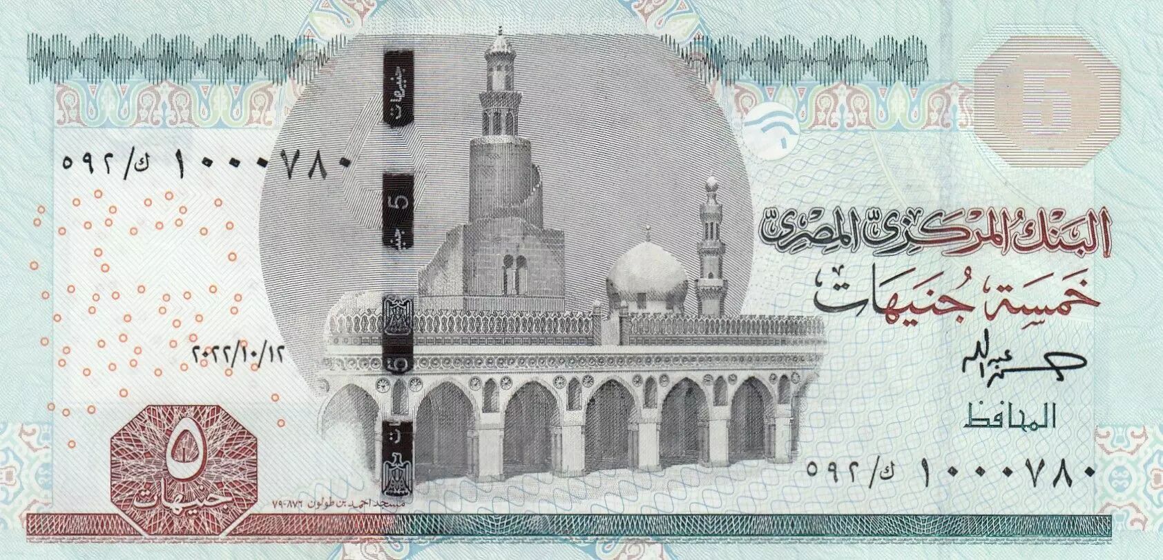Banknote Egypt 5 Pounds - Mosque Ibn Toulon - 2022