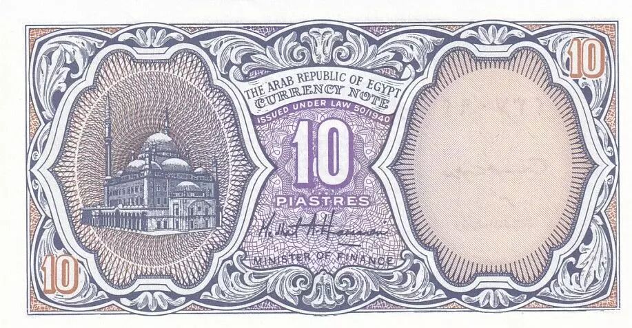 Le verso du billet illustre la Mosquée de Muhammad Ali, également connue sous le nom de Mosquée d'Albâtre, située dans la citadelle du Caire. Les inscriptions sur cette face sont en langue latine. On peut lire les mentions suivantes : "THE ARAB REPUBLIC OF EGYPT", "CURRENCY NOTE", "10 PIASTRES" et "MINISTRY OF FINANCE".