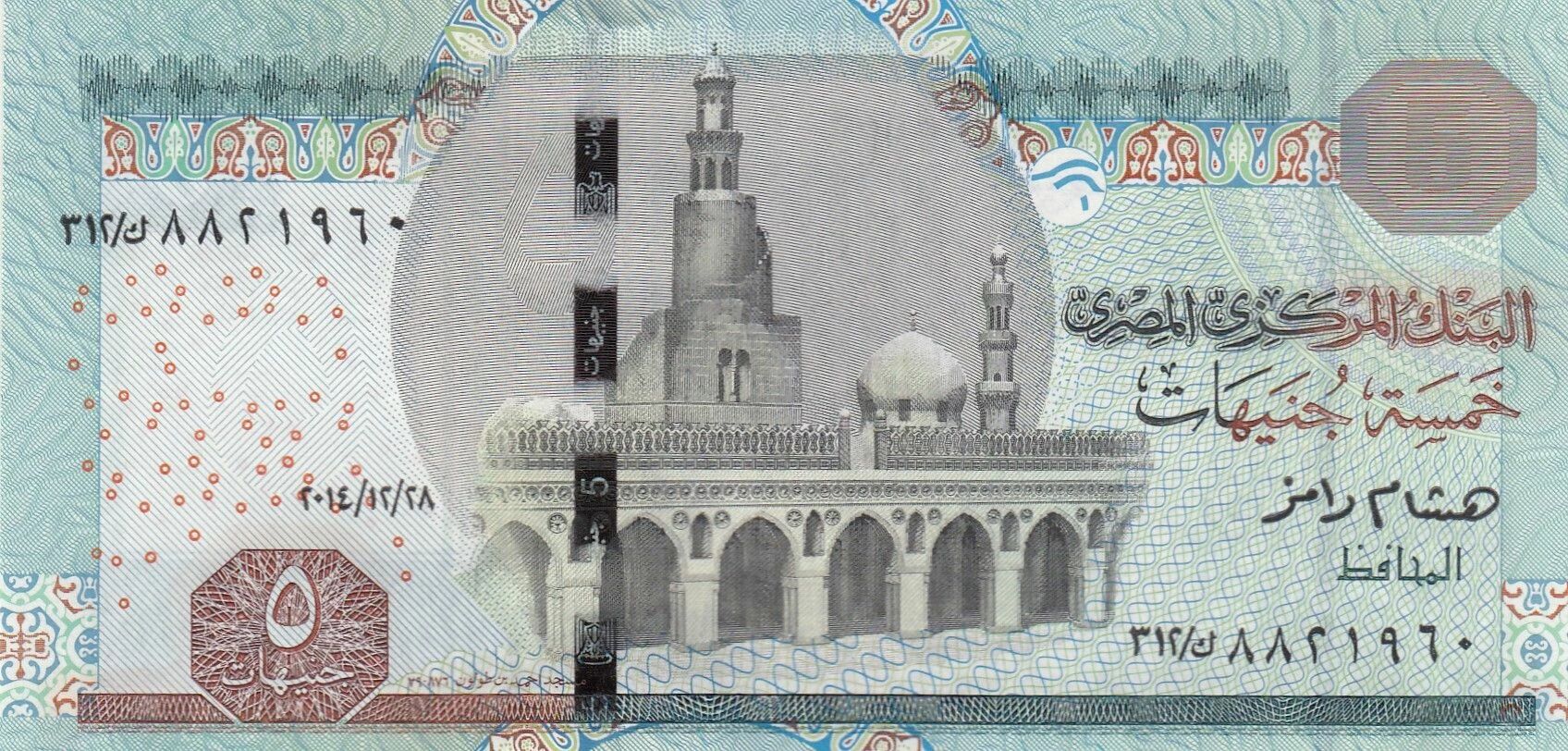 Le billet de banque de 5 livres égyptiennes émis en 2014 présente des caractéristiques distinctives sur ses deux faces.