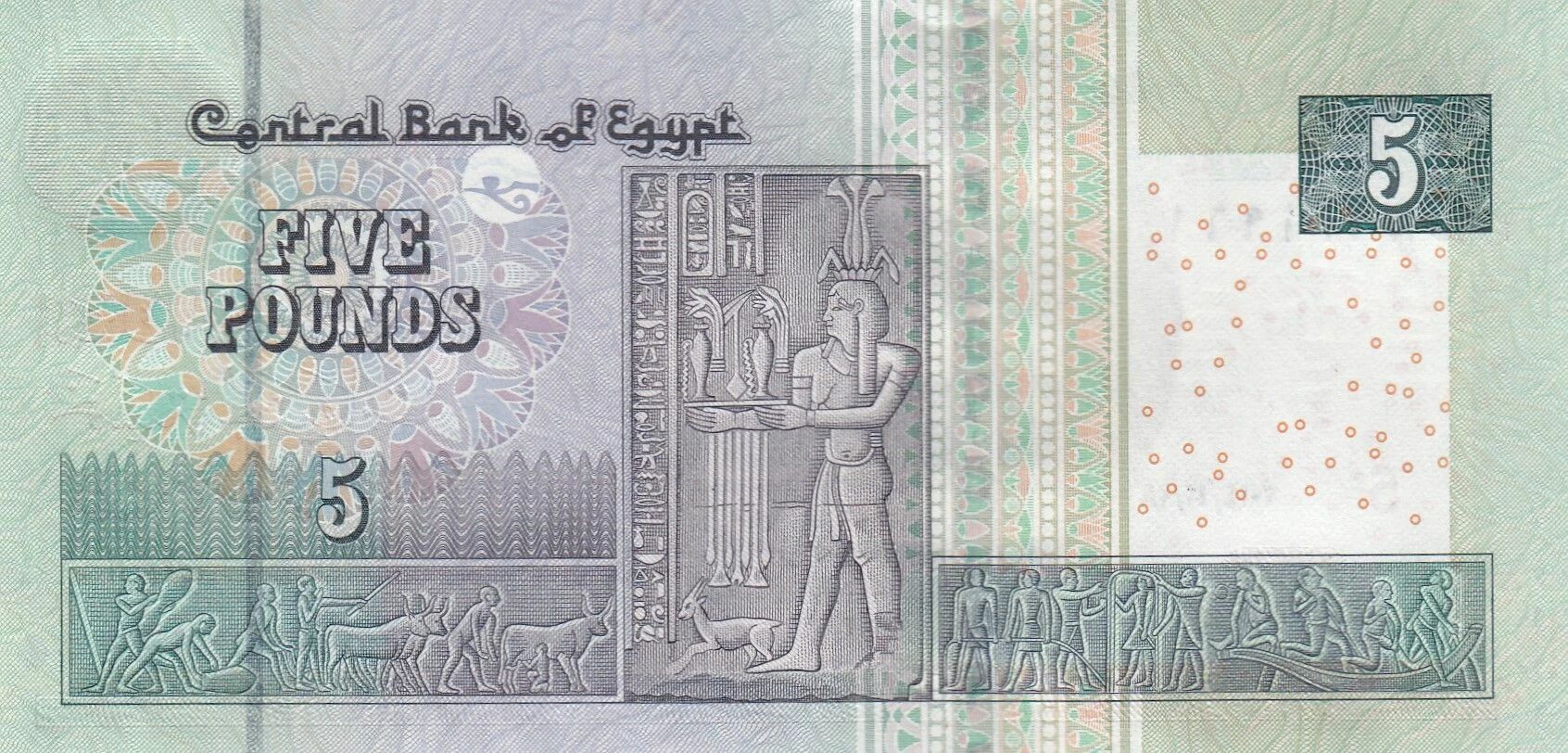 Le filigrane du billet représente le buste du pharaon Thoutmosis III. Ce détail de sécurité intégré au papier fiduciaire est visible par transparence et contribue à prévenir la contrefaçon. À côté du buste de Thoutmosis III, la valeur nominale du billet, « 5 », est reproduite en électrotype, une technique d'impression qui renforce la sécurité du billet.