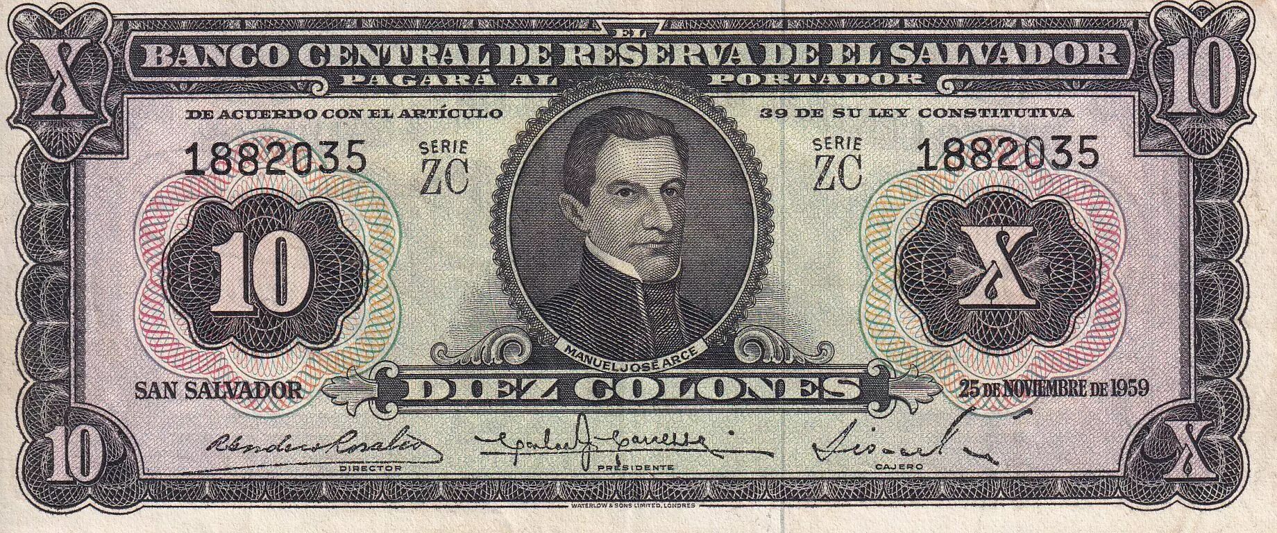 Banknote El Salvador 10 Colones - Manuel J. Arce - C. Colomb - 1959 - Serial ZC - P.99