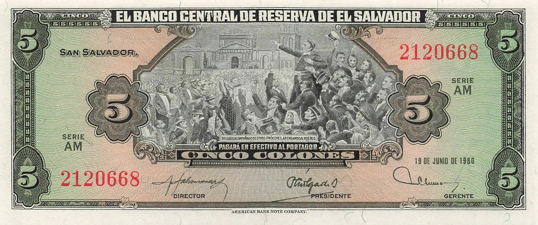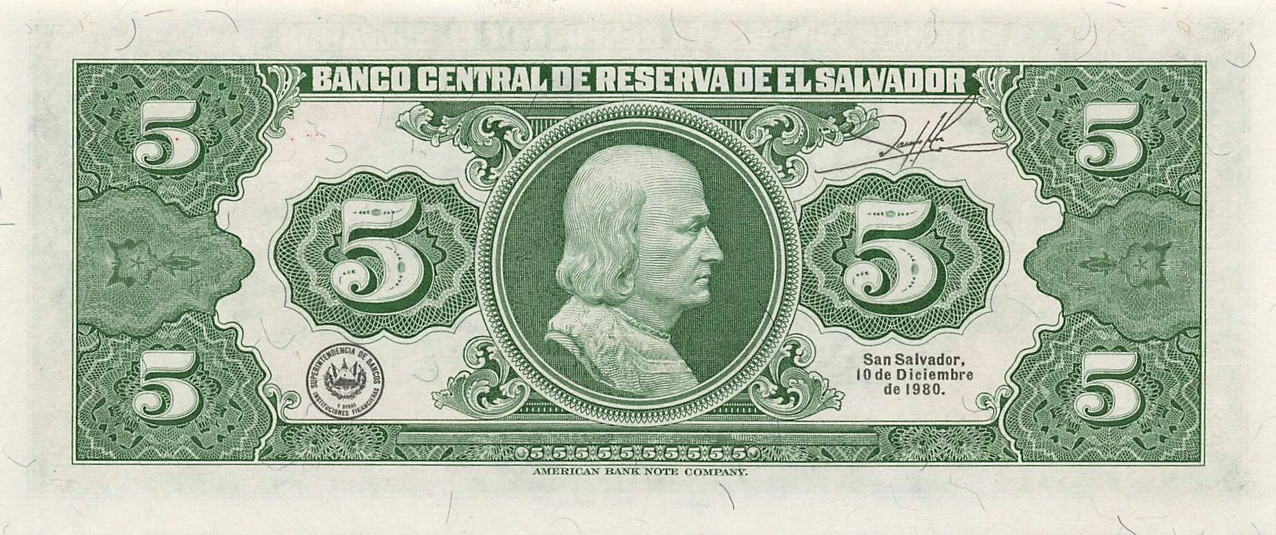 Accueil > Billets du Monde > Billets d'Amérique > Salvador > El Salvador 5 Colones - 1980 - P.132A
