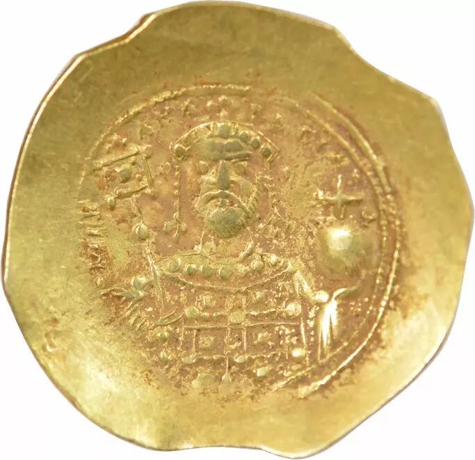Le Christ avec le nimbe crucigère trônant de face vêtu du pallium et du colombium bénissant de la main droite et tenant les Évangiles de la main gauche