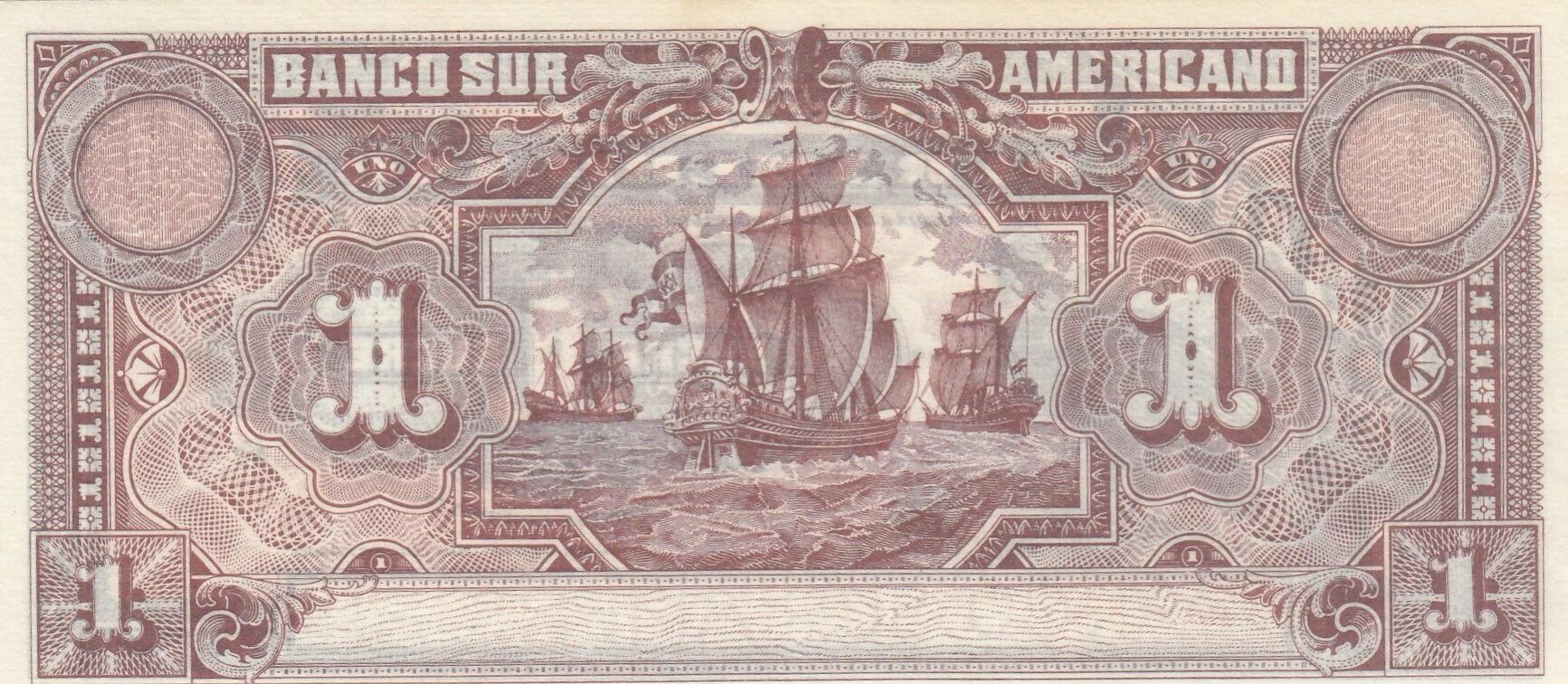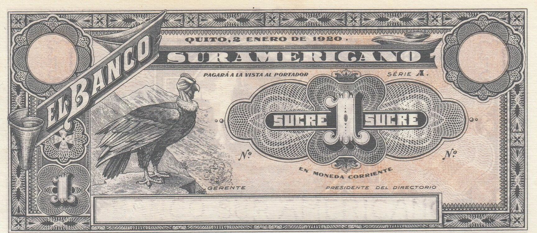Ce billet de banque est un spécimen de cinq sucres, émis par l'Équateur en 1920. Il appartient à la Série A. Le motif principal du billet met en scène le condor des Andes, un symbole national andin, ainsi que l'escadre de Christophe Colomb.