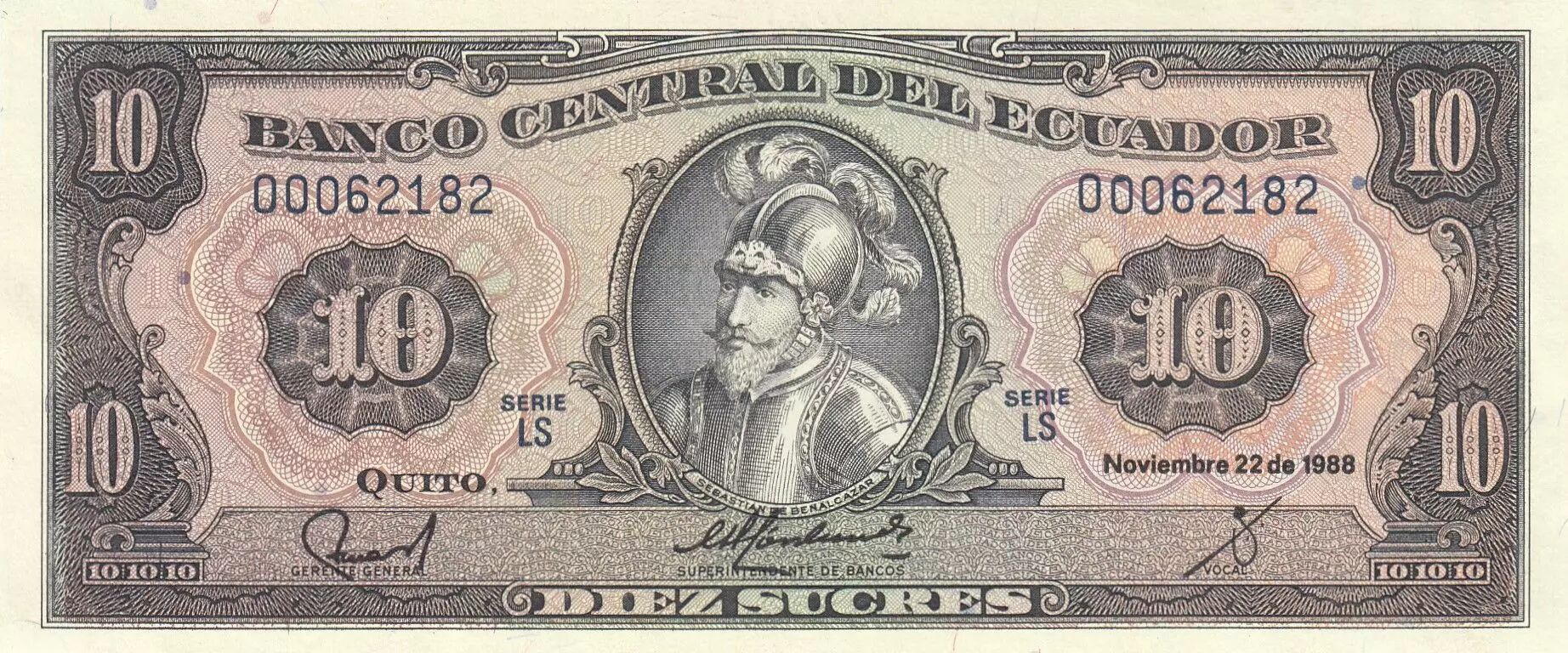 Billet Equateur 10 Sucres - Sebastian de Benalcazar - 22-11-1988 - Serial LS