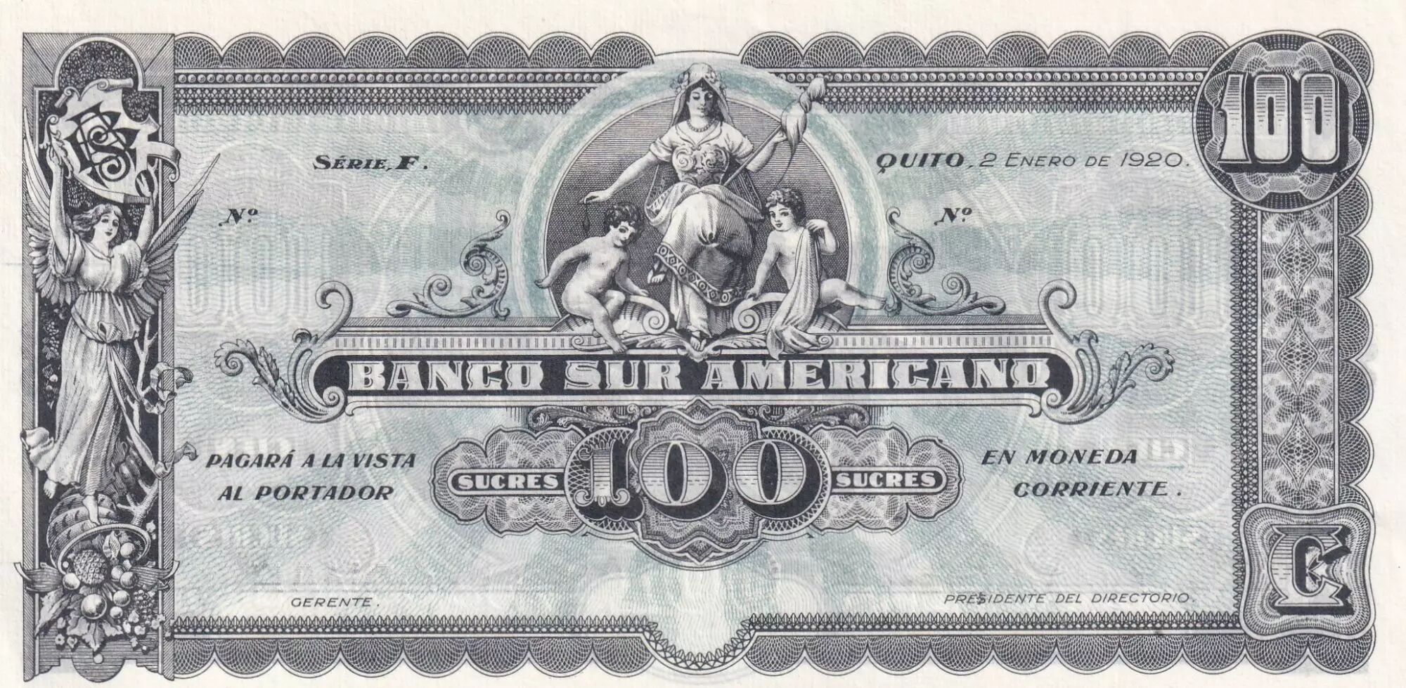 Billet Equateur 100 Sucres - Banco Sur Americano - 1920 - Série F - Sans signature