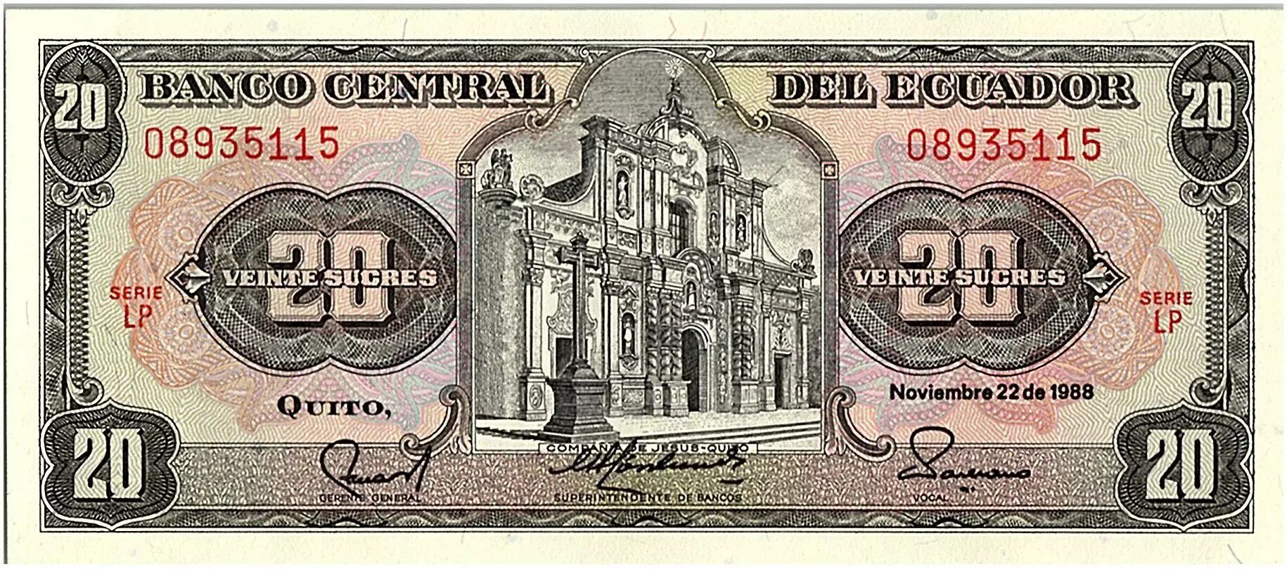 Billet Equateur 20 Sucres - Eglise, armoiries - 1988