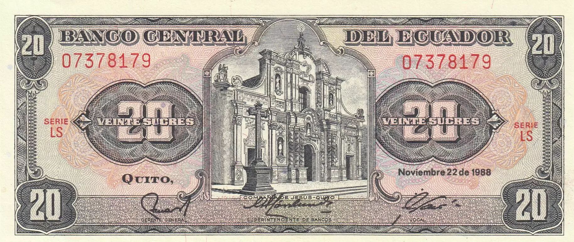 Billet Equateur 20 Sucres - Eglise - armoiries - 22-11-1988 - Série LS