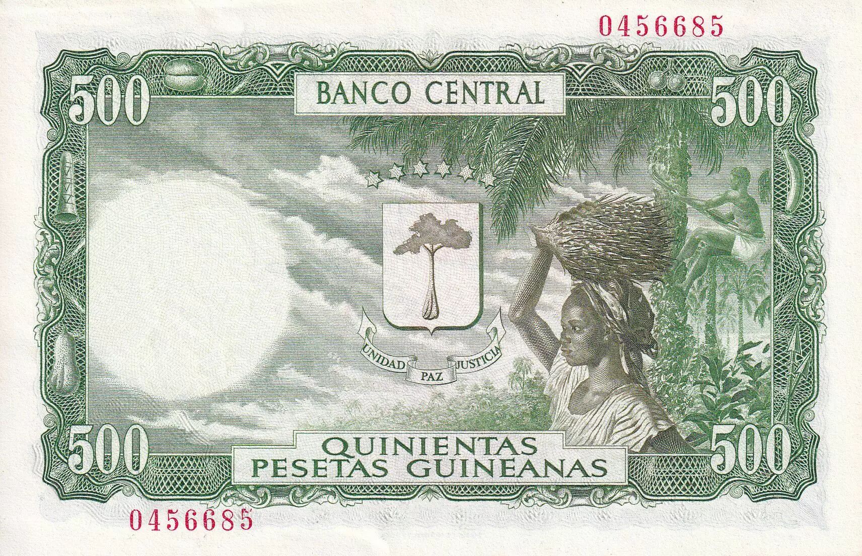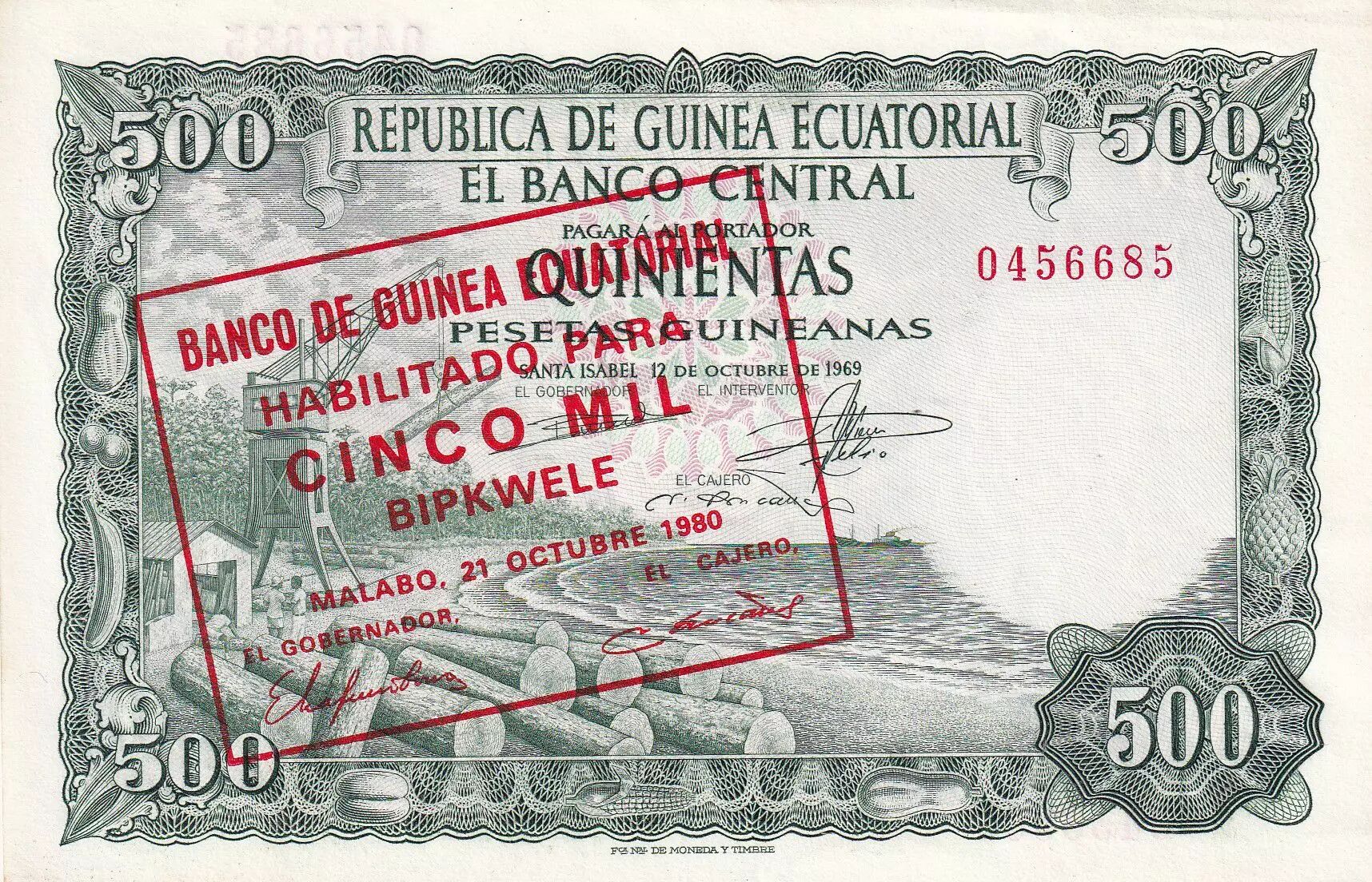 Home > > Equatorial Guinea 5000 Bipkuele on 500 Pesetas - lumbering - 1980 - P.UNC - P.19
