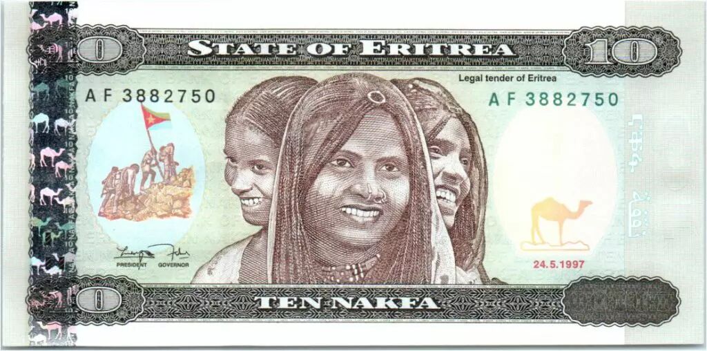 Banknote Eritrea 10 Nakfa 1997 - Three girls, bridge