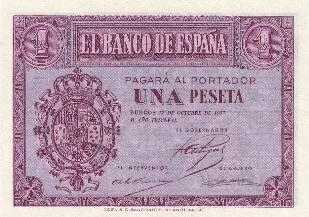 Billet Espagne 1 Peseta - Armoirie - Burgos - 1937 - Série A