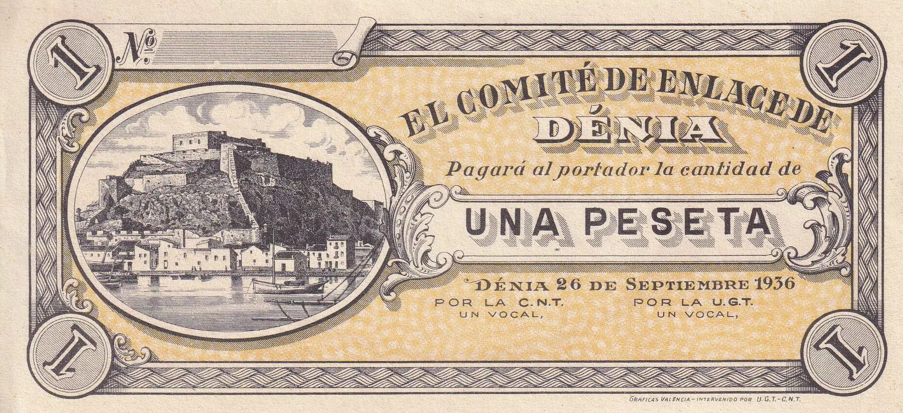 Billet Espagne 1 Peseta - El comité de enlace de Dénia - 1936