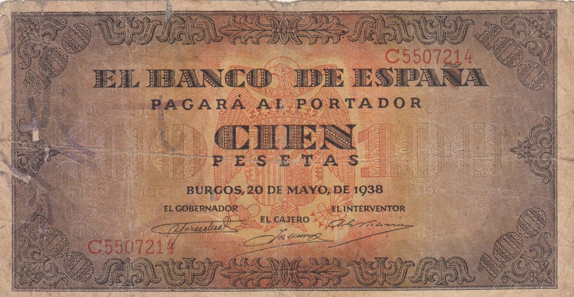 Le billet de 100 pesetas émis en Espagne en 1938, classé dans la série C, présente un intérêt numismatique notable. Ce billet témoigne du contexte historique et économique de l'Espagne durant cette période.