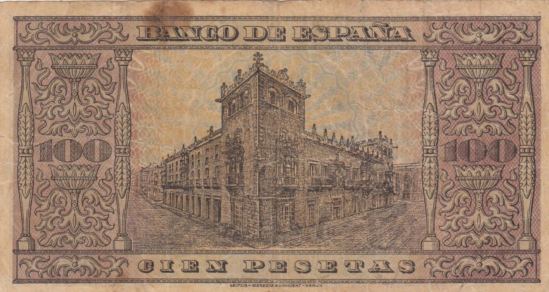 Le revers du billet arbore une représentation allégorique de l'Espagne. Cette figure symbolique est mise en scène de manière à évoquer les valeurs et les idéaux nationaux. La gravure est conçue pour refléter l'identité et le patrimoine culturel espagnol.