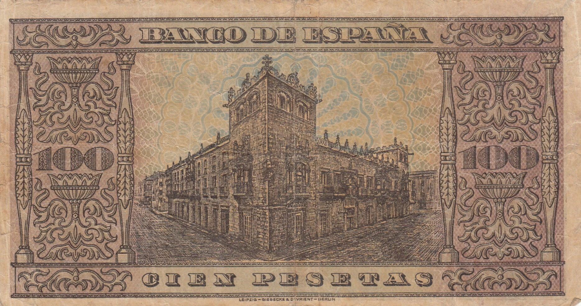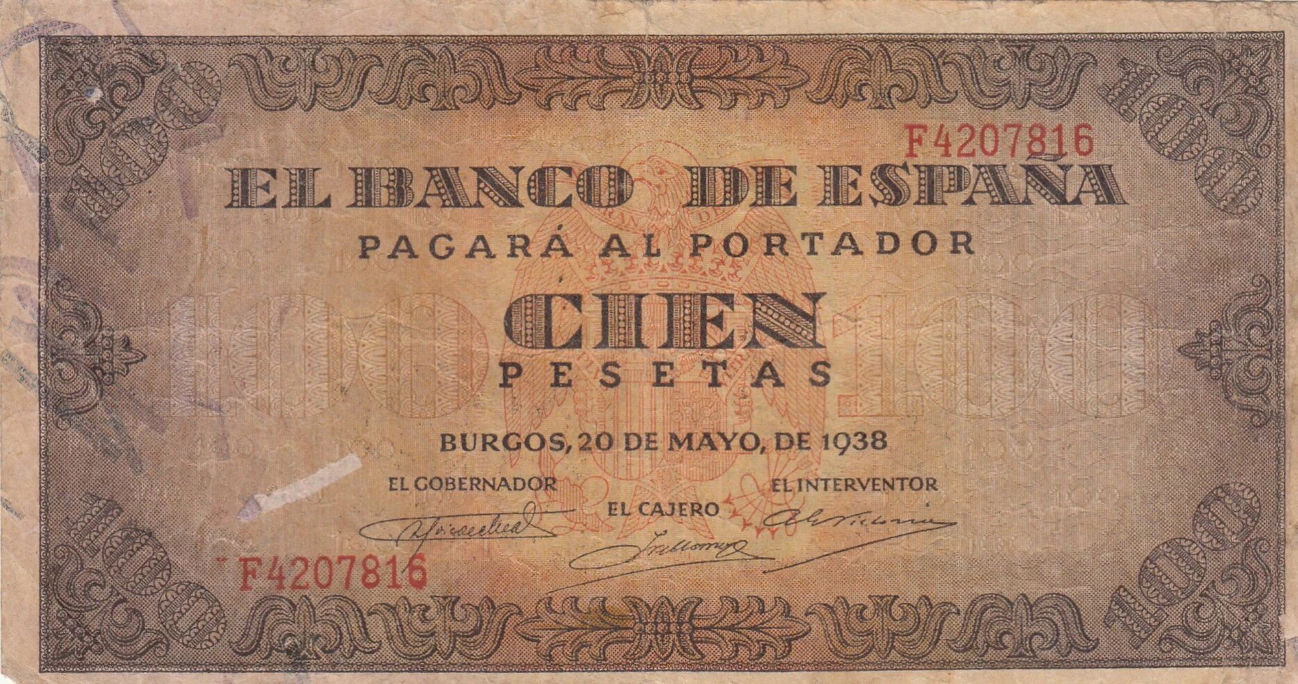 Le billet de 100 pesetas émis en Espagne en 1938, fait partie d'une série identifiée par la lettre F. Sa valeur nominale est de 100 pesetas, l'unité monétaire du pays à cette époque.